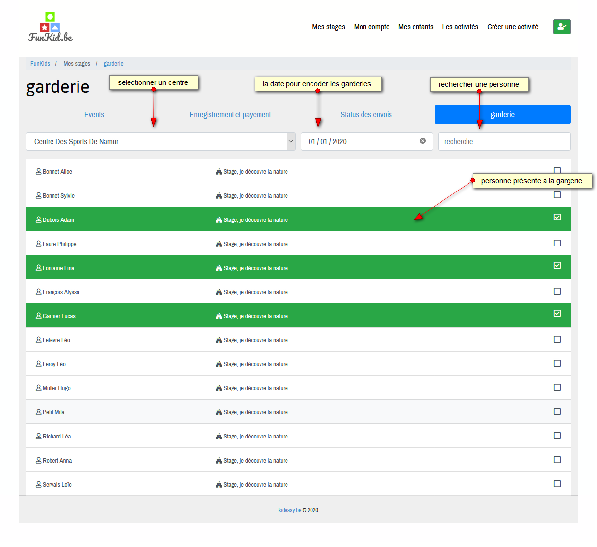 La page garderie permet d'encoder la liste des personnes présentent aux garderies, l'encodage se fait par lieu d'activité et par date.