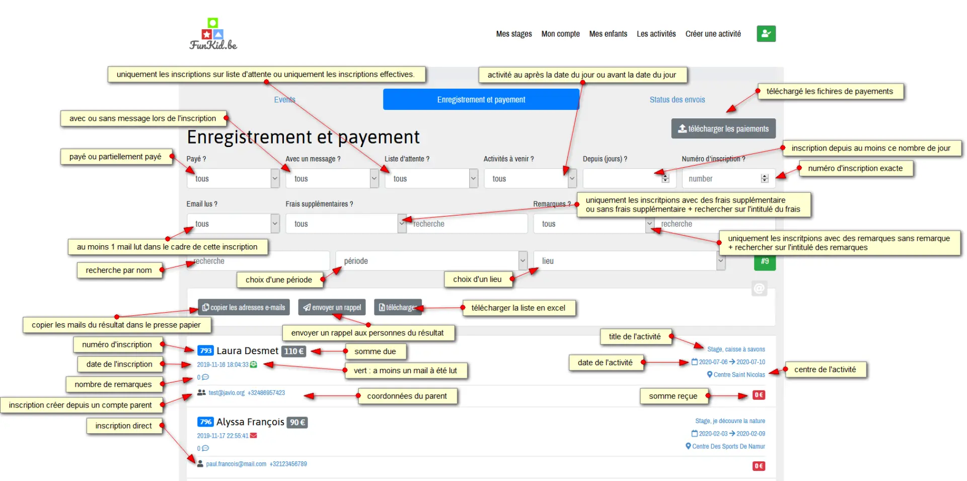 Cette page permet de faire des recherches dans les inscriptions pour gêrer les payements.